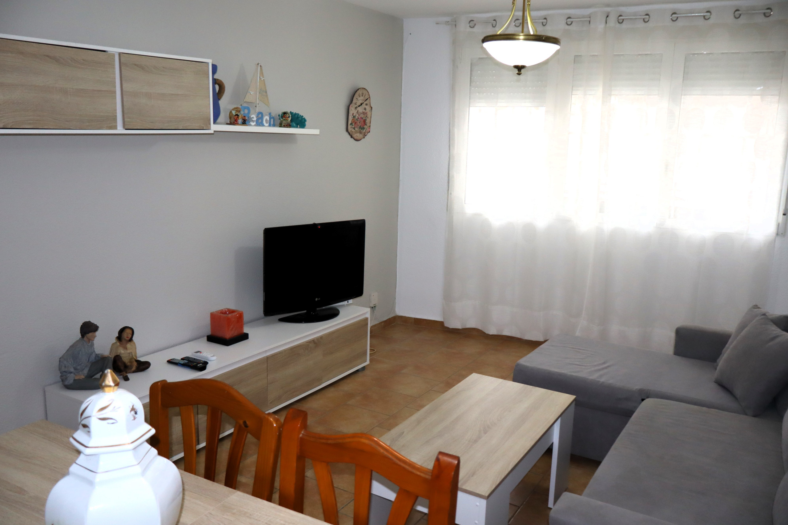Dispone de lavadora, plancha, calefacción bomba de calor, aire acondicionado solo en salón, 1 Televisor.