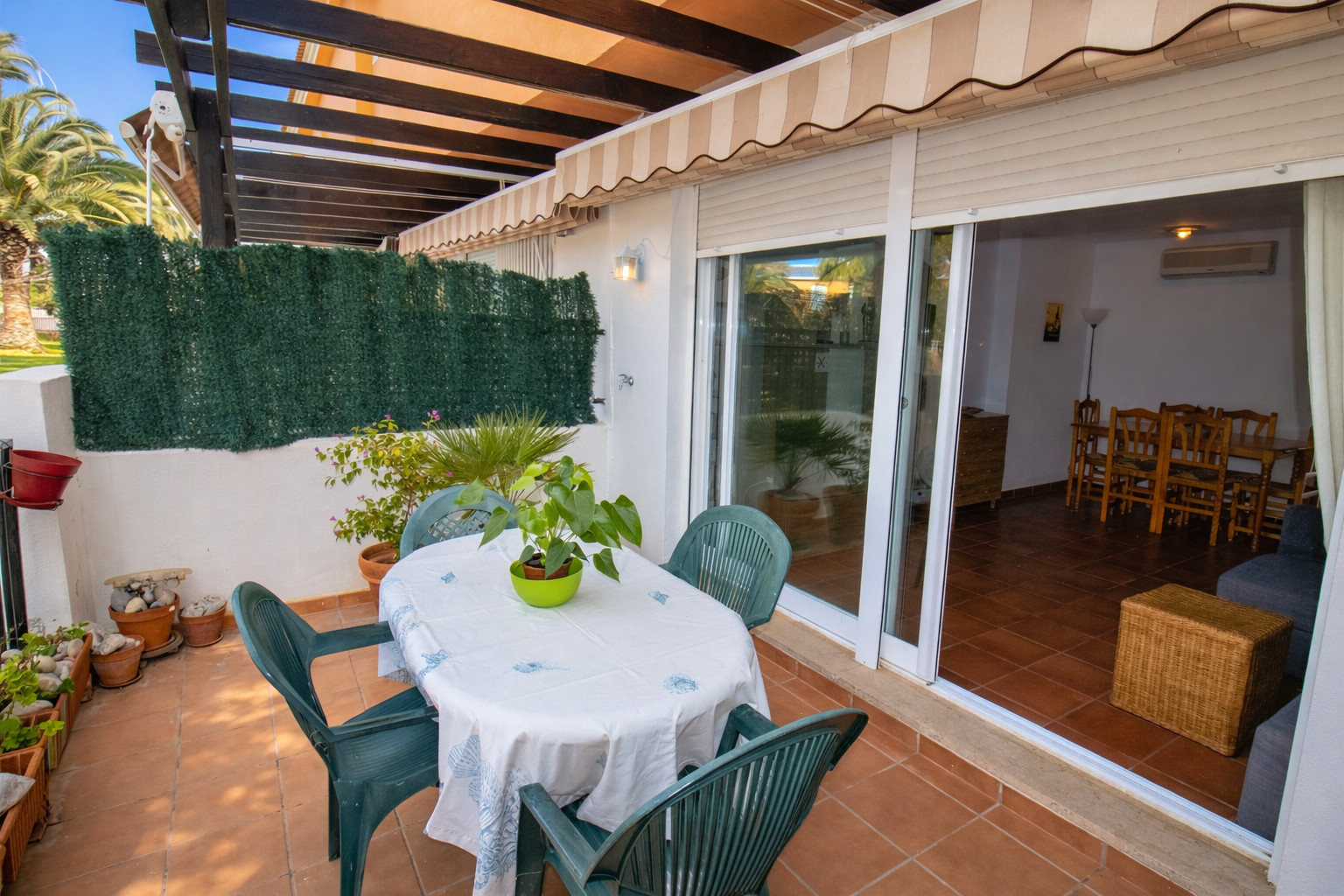Die Terrasse ist geräumig und kühl, mit einer Markise, die es Ihnen ermöglicht, auch in den heißesten Stunden ruhig zu sein, auch dank der Ausrichtung der Terrasse.