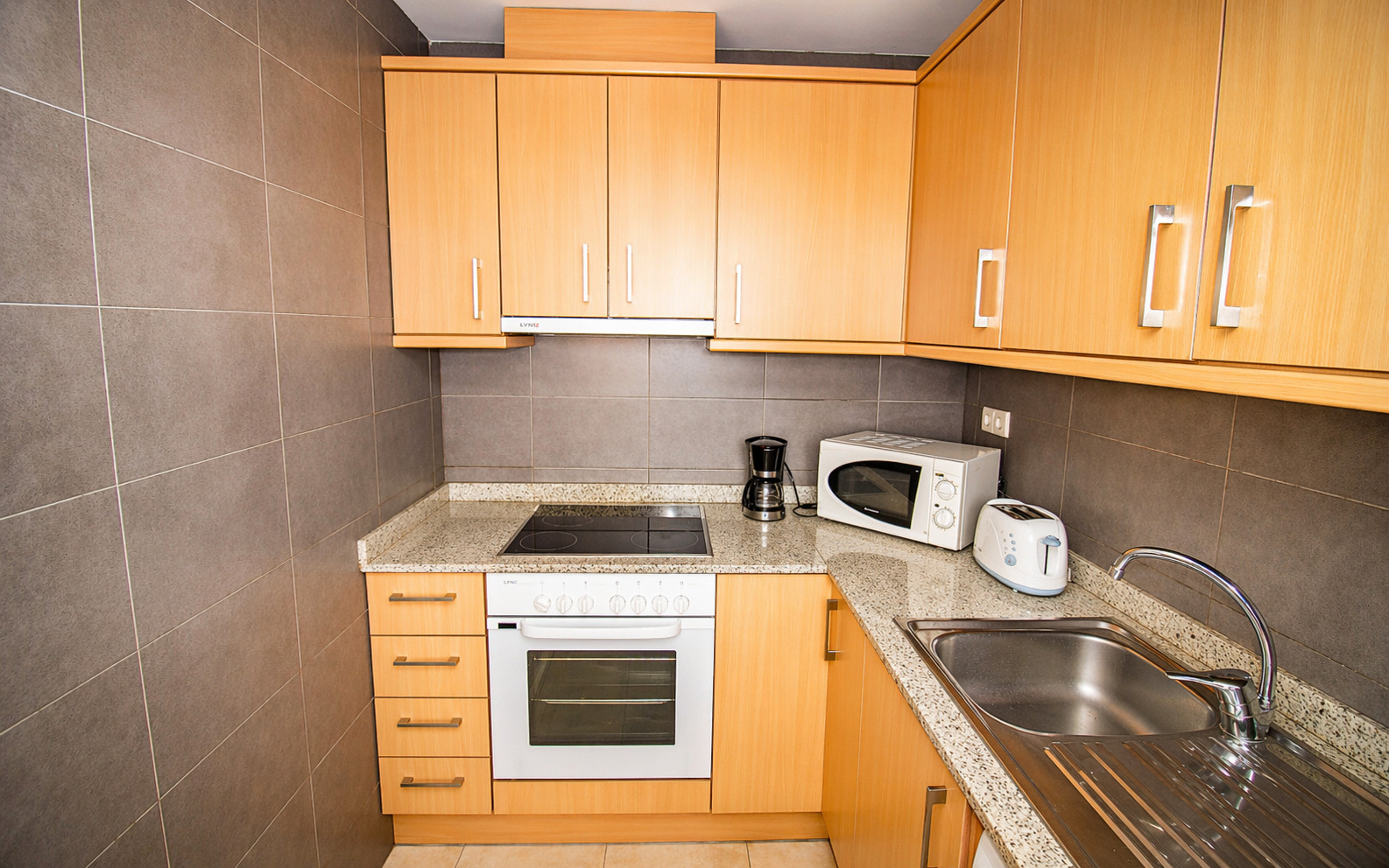 La cuisine américaine, à vitrocéramique, est équipée avec réfrigérateur, micro-ondes, four, congélateur, vaisselle/couverts, ustensiles/cuisine, cafetière et grille pain.