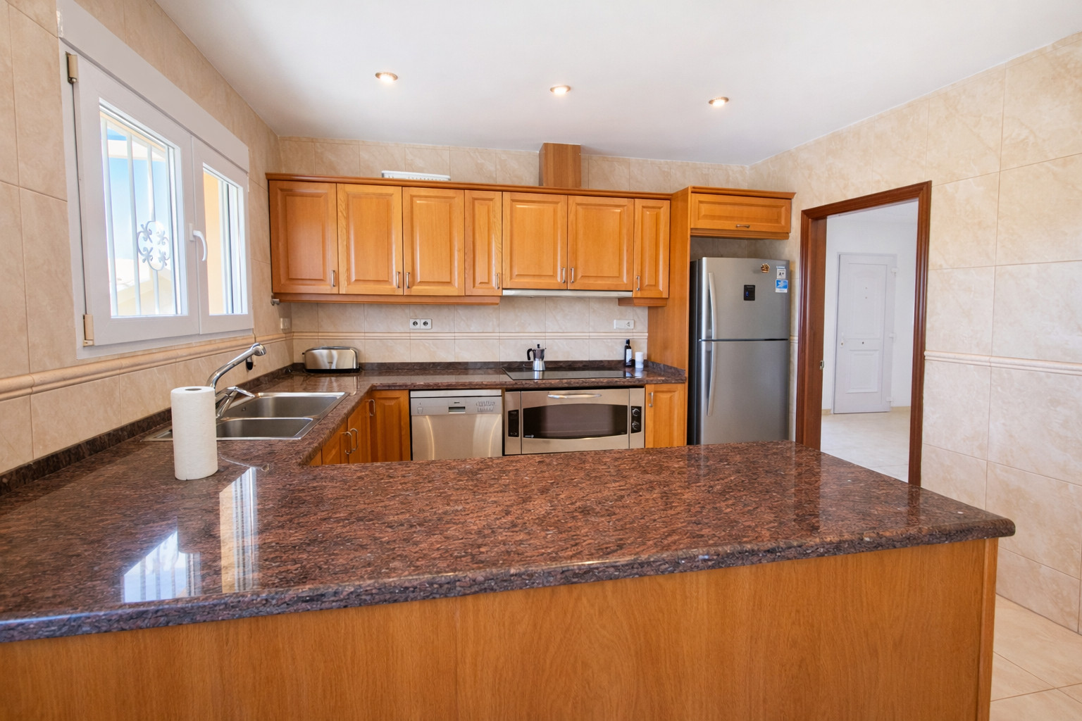La cuisine indépendante, à vitrocéramique, est équipée avec réfrigérateur, micro-ondes, four, congélateur, lave-vaisselle, vaisselle/couverts, ustensiles/cuisine, cafetière et grille pain.